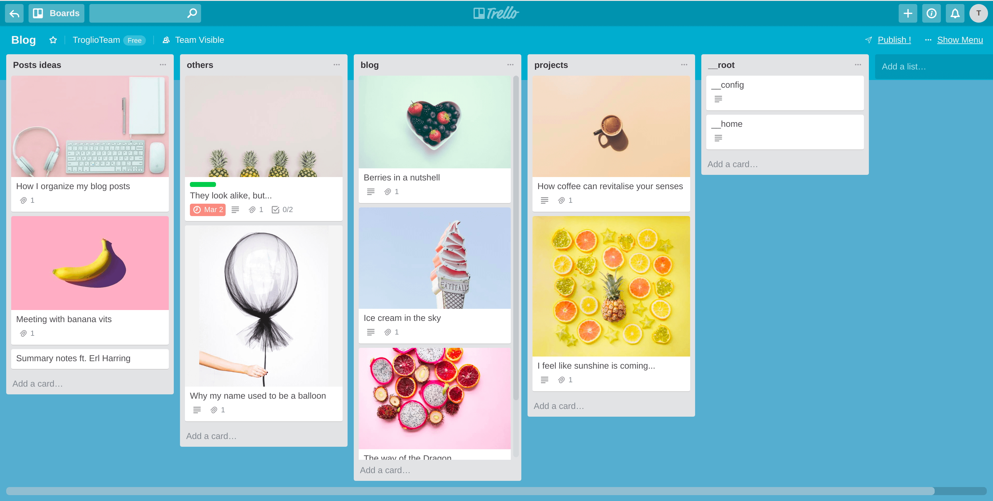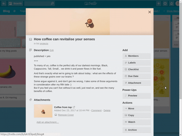 Troglio comes with all the tools you expect from a classic CMS: custom types, publish/draft logic, template override... and even live previews ! Using TOML, authors can enrich content with more structured data leading to endless possibilities. Finally, the most important part of Troglio is that it is an opninionated framework to manage apps and websites content from Trello: it removes the need for each developers to think about implementation details and Troglio helps get started right away. Examples, tutorials, starters, support... are all the benefits given from having a common framework to work with instead of being isolated :) Don't be shy and help us enhance Troglio's experience by submitting an issue in our Github repo.